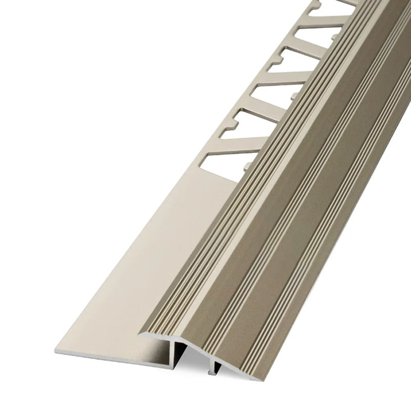 El Perfil Ramp de aluminio en níquel mate permite una transición limpia entre superficies con leve