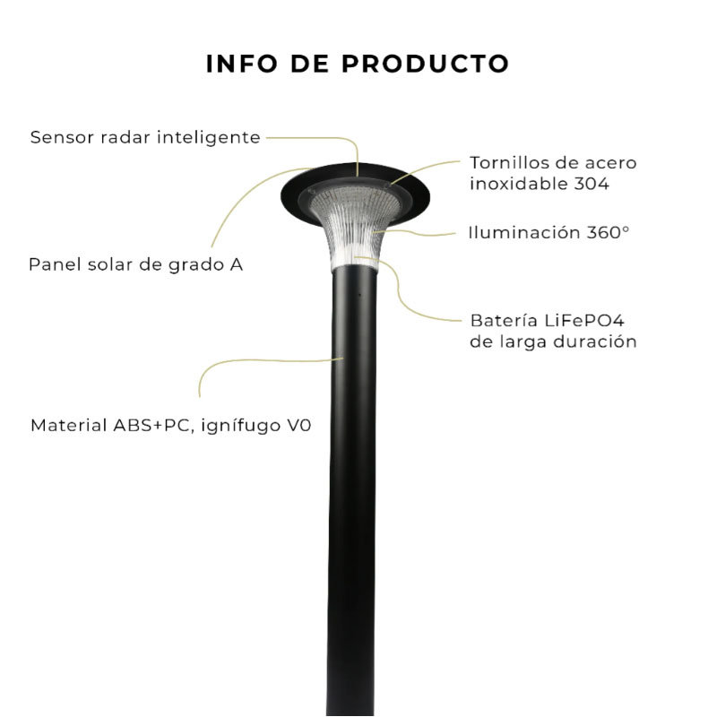 84 SMD2835, batería Litio 6000mAh 3.2V reemplazable Grade-A. Modos: sensor e iluminación continua. Instalación en superficie plana o en tierra con estaca Spike. Presentación en caja con 4 unidades