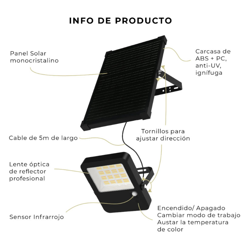 384 SMD2835, batería de litio 6000mAh 12.8V reemplazable. Iluminación continua personalizable con control remoto y sensor AIM. Tres temperaturas de color: 3000K, 4000K y 6000K. De 6 a 8 h de carga bajo luz solar fuerte