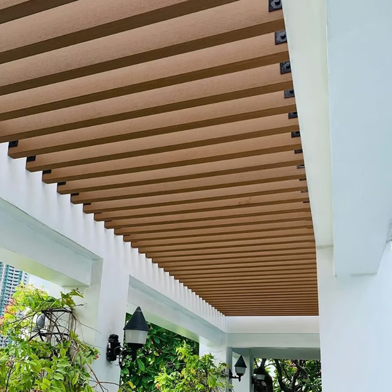 Viga Co-Extruded G04 Teak, de estética cálida y natural, ideal para estructuras exteriores visibles. Su tecnología co-extruida asegura resistencia al clima, protección UV y bajo mantenimiento, en tono marrón claro.