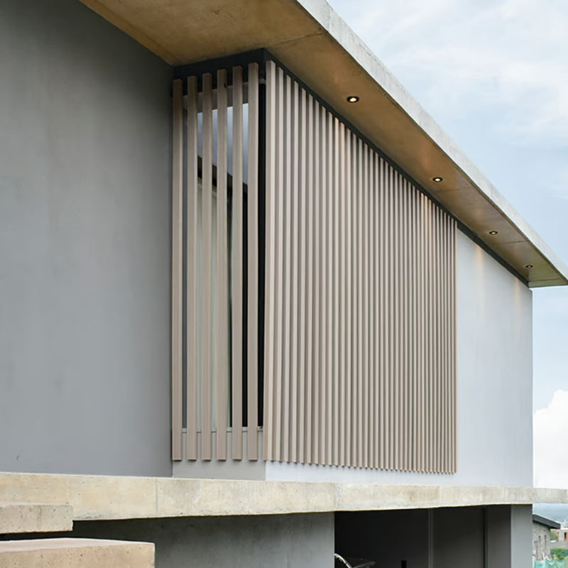 Viga Co-Extruded G02 Antique, solución estructural para exteriores con estética sobria y contemporánea. Su recubrimiento co-extruido protege frente a manchas, decoloración y condiciones climáticas adversas, en tono grisáceo.